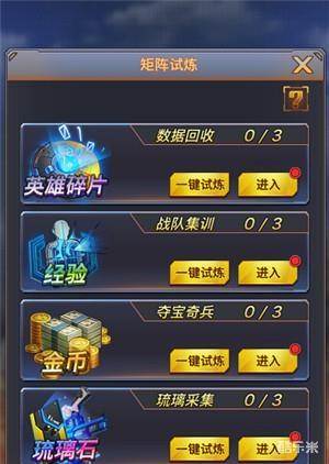 枪魂中,矩阵试炼是什么玩法?如果通关矩阵试炼,玩家能获取哪些奖励?本期超好玩小编就为大家详细介绍下枪魂中矩阵试炼的玩法,一起来看看吧! 矩阵试炼,可以说是福利专区。在这里,可以领英雄碎片,经验,大量金币,和升级副官的琉璃石。 随着等级的提升,试炼逐步开启,且每个试炼有5个等级,不同等级难度不同,奖励更是不同。达到等级要求可开启一键试炼,简单方便。如下图。 1. 数据回收: 挑战可获得大量英雄碎片,每周一,三,五开启。不可手动躲避蝎子追杀,到达终点,即可完成挑战。 2. 战队集训: 挑战后可获得大量经验,升级战队,可挂机完成。左右开攻,体验爽到爆。 3. 夺宝奇兵: 不可自动操作,击杀小偷机器人。抢夺他们身上的金币,即可收入囊中。 4. 琉璃采集: 手机琉璃石的重要场所,限时时间内穿越迷宫,即可获得奖励,注意要谨慎摸索,不然会迷路哦。听说有个秘诀叫“左左右右”。你也可以自己摸索摸索~嘘,一般人我不告诉他。