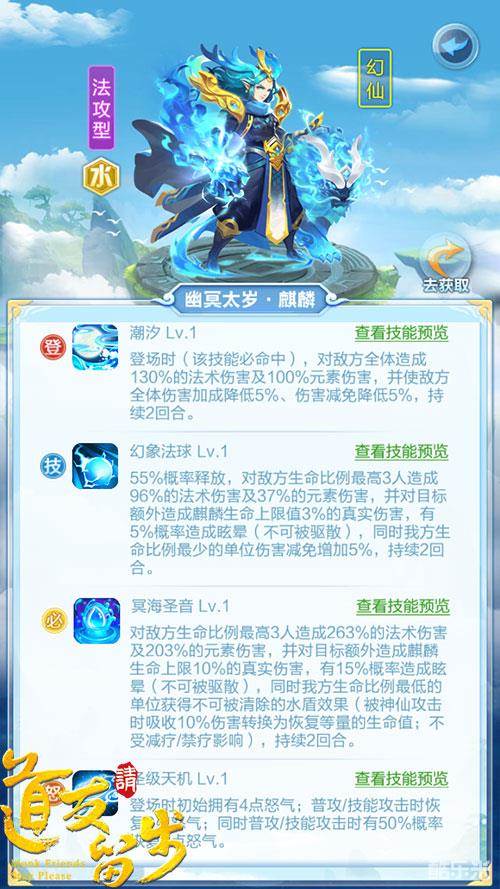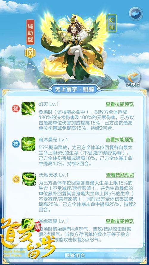 既然有像麒麟这样暴力输出的幻仙,当然也少不了像鲲鹏这样的绝世好奶妈。在幻仙鲲鹏出现之前,《道友请留步》的第二阵容中大多是攻击型幻仙,唯一的辅助型幻仙只有橙色幻仙椒图,其能力在实战中只能说是差强人意,如今鲲鹏的出现终于填补上了辅助位的缺乏,让我们一起来看看鲲鹏的各项技能:
