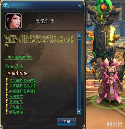 2、当玩家间成为【挚友】关系后,只要亲密度满足条件即可在成都坐标【353,216】NPC散花仙子或其他主要村庄NPC散花仙子处完成其相关任务后可以申请其他好友关系。