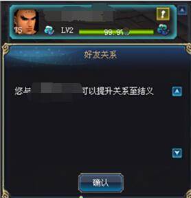 在亲密度达到知己2级42.1%时会出现好友关系提升至结义的提示,当点击提示后会弹出提示框如下图所示: