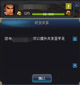 在亲密度达到结义3级85.7%时会出现好友关系可提升至手足的提示,当点击提示后会弹出提示框如下图所示: