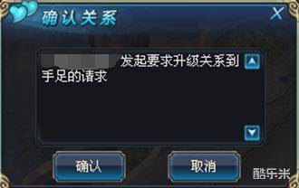 当队伍中申请人向另一人发送提升好友关系至手足关系的申请时,弹出对话框如下图所示:
