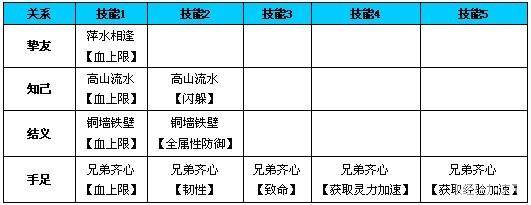 3、当好友关系类别在【结义】阶段的时候,该阶段分等级激活技能如下:
