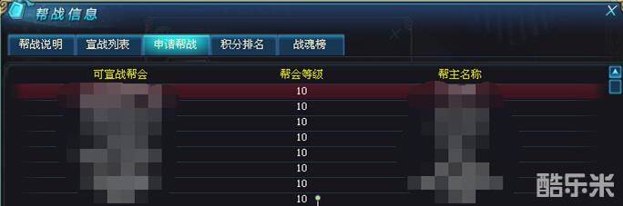 申请帮战功能将提供帮主更方便的进行宣战申请,该界面显示可宣战帮会、帮会等级、帮主。