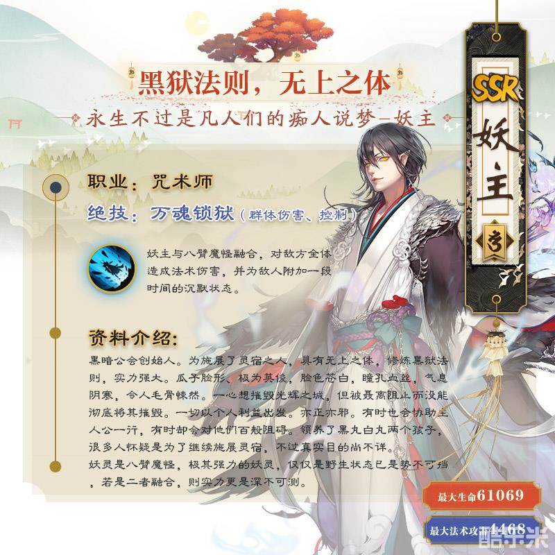 限时祭典玩家最关心的自然还是限时抽取的SSR妖灵师!妖主也终于正式登场啦!作为黑暗公会的创始人,神秘莫测的妖主让身边的所有人都充满忌惮,聂离也将其视为极具威胁的对手。妖主的绝技万魂锁狱不仅能造成巨额的群体法术伤害,还带有沉默效果,让对手失去还手之力。妖主是本期限时祭典的限时UP妖灵师,喜欢他的玩家千万不要错过这次机会哦~