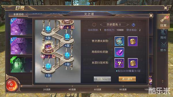 推荐小技巧:尽量每层完成高级条件,一定要手动,自动很容易就被一直控制到死,手动可以缓技能迂回着打,勤利用翻滚躲避控制技能,先挑血量低的怪打,往往这些怪攻击力很高。