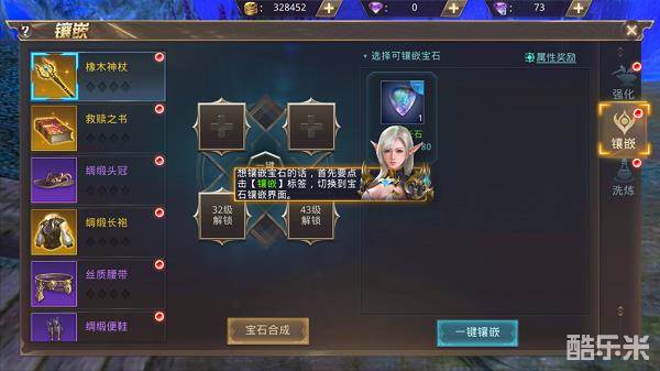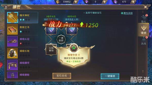 系统很贴心的为我们设置了一键镶嵌。一键镶嵌则是将我们现有的宝石自动补充到空缺的孔位中,省的我们再去点了,节省我们大量时间。瞬间提高我们的战力。