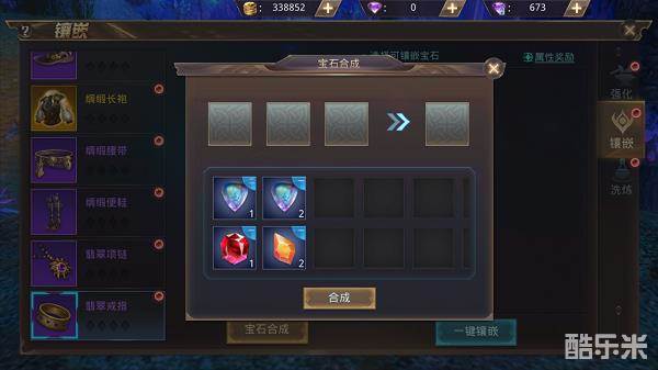 宝石每三个相同的低级宝石可以合成更高一级的宝石,不仅可以节省我们的宝石孔位数,并且更高等级的宝石提供的属性要高很多,所以宝石数量多的时候不要忘记合成更高级的。