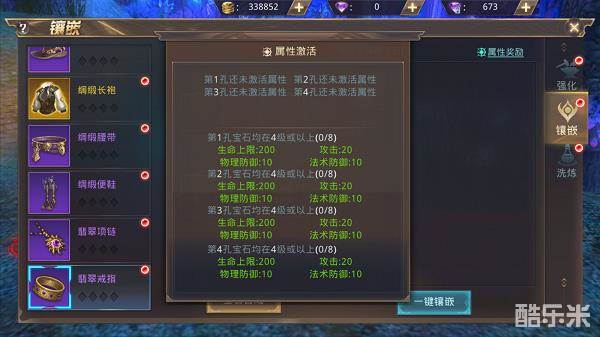 当宝石孔位按位置均在四级以上会有不同的加成效果相似于装备强化的加成效果,按要求镶嵌到指定数量的宝石会解锁镶嵌加成,会大量提升自身的各项属性。