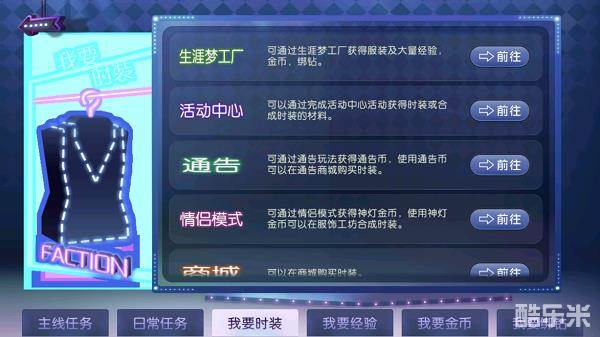 同时,任务系统也上线了各个分类,无论你要时装还是经验,都可以通过分类轻松满足愿望。曾几何时,我们在劲舞世界里东奔西跑,只为找到一身心仪的衣服。在全新优化的任务系统中,只要轻戳“我要时装”分类,就可以看到获得服装的各种方式,轻松跳转界面,get最新时装~通向舞台的路已经为你铺好,满足你的时尚明星梦!