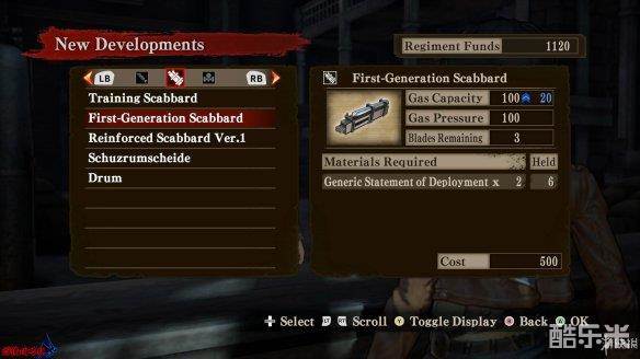 [剑鞘/储气罐]属性:[Gas Capacity|气体容量]、[Gas Pressure|气体压力]、[Blades Remain|剑刃储备量],其中[气体压力]影响使用气体移动时的速度。升级会增强除[剑刃储备量]之外的两项属性。