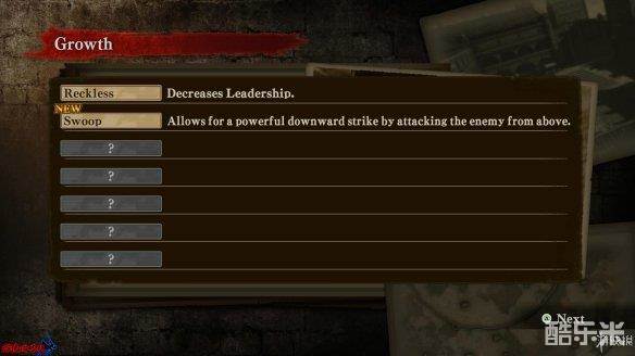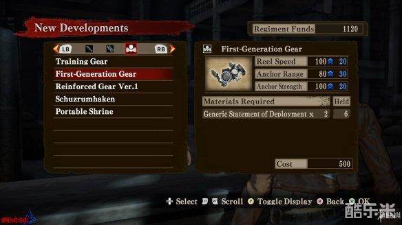 [立体机动装置]属性:[Reel Speed|卷轴速度]、[Anchor Range|钩索范围]、[Anchor Strength|钩索强度]。[卷轴速度]影响立体机动装置的突进速度,[钩索范围]影响进入战斗模式的距离,[钩索强度]影响钩住巨人状态下的时间。升级同时增强三项属性。