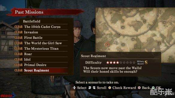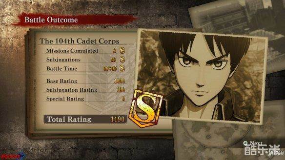 游戏的过关评价标准有三个:[Mission Complete|任务完成数]、[Subjugations|讨伐数]、[Battle Time|过关时间]。任务完成数和讨伐数需要获得[S]评价必须完成除主线之外的全部任务和击杀全部巨人,过关时间越短评价越高,至于每个关卡的具体数值就需要玩家自行去刷了。下方的[Base Rating|基本得分]、[Subjugation Rating|讨伐得分]、[Special Rating|特殊得分]分别与完成任务评价、巨人讨伐数、特殊任务有关,三者相加得到[Total Rating|总体评分]。