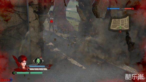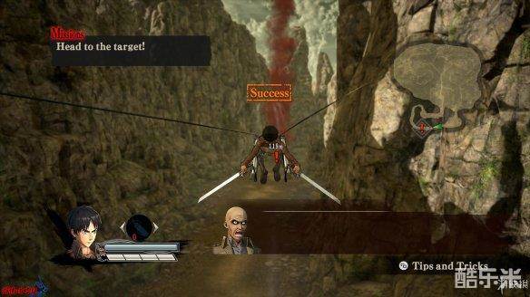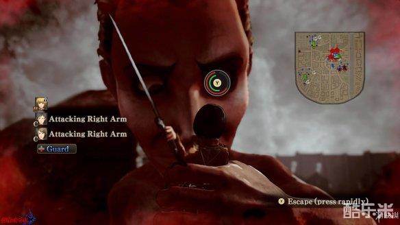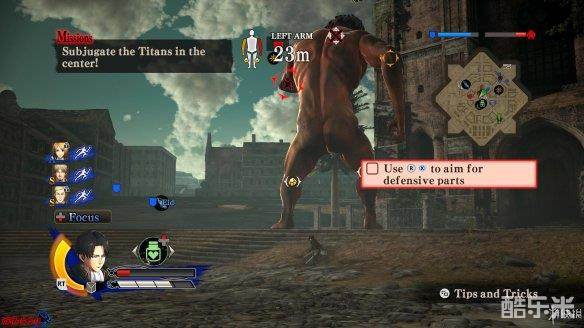 战斗状态中,[小型巨人]只能锁定[后颈],而[大型巨人]除后颈外,[手臂]与[膝盖]部位也能被锁定。锁定部位后,使用钩索命中,同时会显示出与该点之间的距离。命中后可用左摇杆微调方向,期间也可以利用气体快速调整,不使用左摇杆则会飞向命中位置,在镜头拉远时按下[攻击]完成一次战斗。