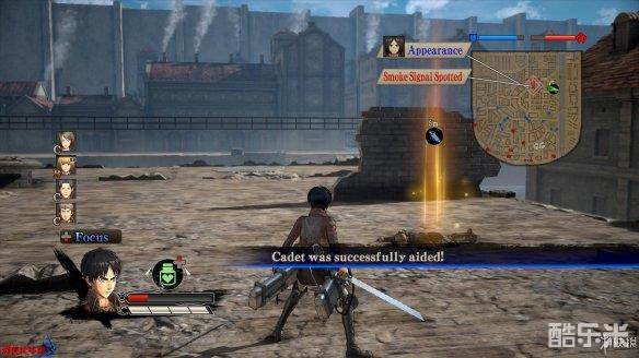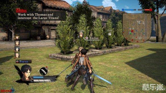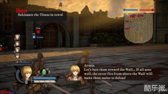 小队成员的状态有[Fan Out|出击]、[Escort|护卫]、[Focus|集中]等,出击状态下小队成员会主动攻击附近的巨人,护卫状态下的小队成员会保护重要己方成员,集中状态则会令小队成员协助玩家攻击当前的目标。小队成员越多,整体进攻会变得更加强势(人多当然强了)。成员有时当玩家站立不动时会给予道具,在攻击巨人时也会使用道具。如果操控角色的[Leadership|领导力]较高,将状态设置为[Orders|命令],小队成员可以直接攻击自己瞄准的部位,例如[Armin|阿尔敏]。
