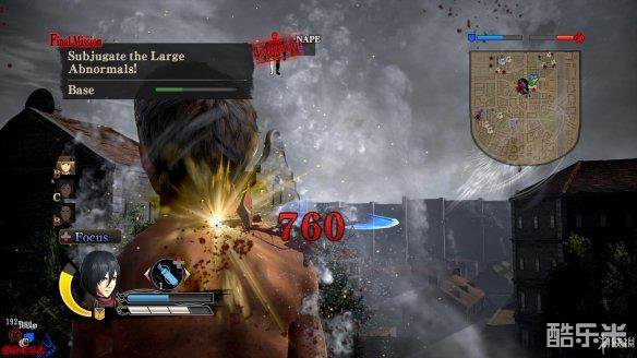 如果飞向钩索命中位置时的速度不够,造成伤害数值颜色显示为白色,甚至有攻击可能被巨人挡下,完美攻击时的数值则显示为红色。飞行过程中可以使用气体加速,以增加伤害。部分巨人身体部位会在攻击后掉落[材料],通过[金色标记]区分,参看上图巨人的左膝盖处。