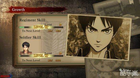 通过总体评分结算经验值,分别加在[Regiment Skill|兵团技能]和[Soldier Skill|士兵技能]之上,玩家能控制的角色均为调查兵团,因此前者经验等级共享,而后者经验则是每个角色单独计算,除此之外的其他资源共享。前者升级可以解锁更多游戏内容,后者升级则可以解锁角色技能,均为[被动技能]。