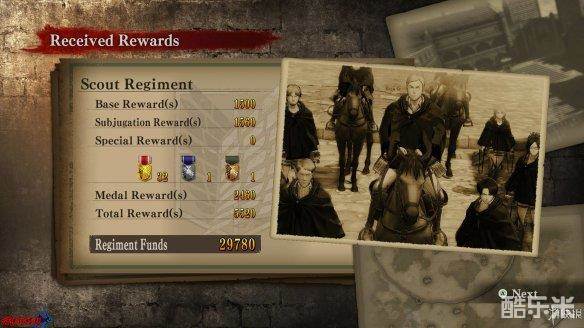 根据过关评价结算的总体评分,加上[Medal Reward|奖牌奖励],结算出完成关卡获得的[Regiment Funds|团队资金/RF点]。在讨伐巨人时共有[金\银\铜]三种奖牌,奖牌会在击杀巨人后给出,判定依据基于玩家攻击单一巨人的次数,次数越多,评价越低。