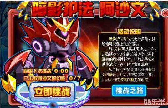每3分钟挑战1次阿沙文,可能遇到阿沙文的幻影或阿沙文的真身!击败阿沙文的幻影次数越多,遇到真身的几率越大。连续7次击败阿沙文幻影,必定遇到阿沙文真身!