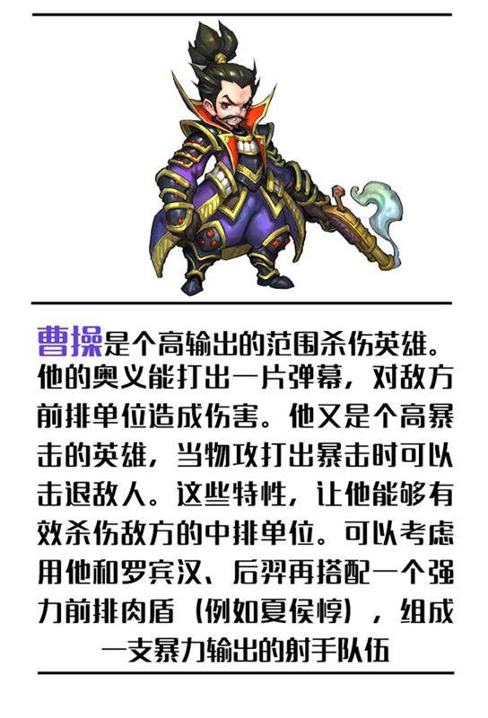 曹操是三国时期的枭雄人物,精兵法,善诗歌,时常抒发自己的政治抱负,并反映汉末人民的苦难生活,气魄雄伟,慷慨悲凉;散文亦清峻整洁,开启并繁荣了建安文学,给后人留下了宝贵的精神财富,史称建安风骨;在圣魂中,他是一个手持火铳,一身铠甲的射手将军