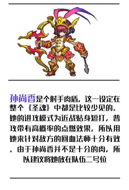 孙尚香是三国时期英雄人物孙策和孙权的妹妹,后来嫁给了刘备。在圣魂中是一个红衣短裙,元气满满的少女形象