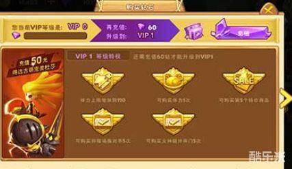 今天小编先为大家介绍下游戏中VIP1会获得什么特权,为什么介绍VIP1呢,因为这个只要冲6块钱就可以获得啦。