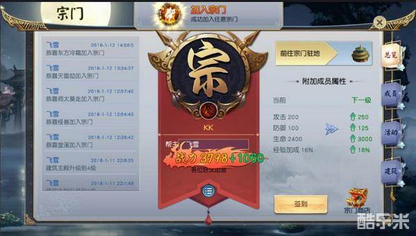 加入宗门后会根据宗门等级进行战力加成哦!根据宗门的建筑等级,等级越高宗门成员属性加成越高!