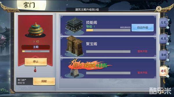 点击建筑可查看当前宗门建筑等级,在宗门任务中获得的宗门令都可在此捐献获得宗门贡献的同时能够升级宗门建筑,建筑每升一级,宗门成员自身属性也会获得提升哦!
