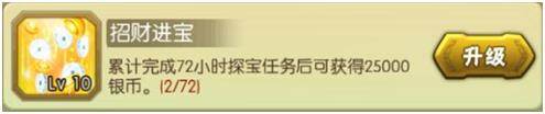 这个技能供给额外的银币收入,每提升一级额外增加2500银币,满级后每探宝72小时额外奖励50000银币。