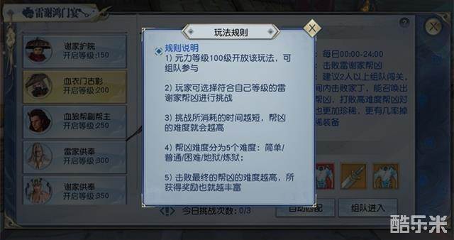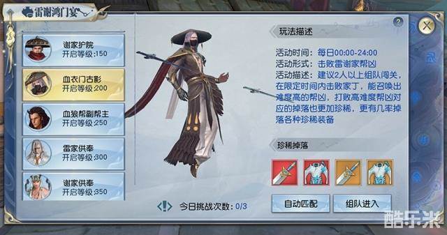 雷谢鸿门宴玩法在大家元力等级达到100级的时候才会开启,每天可以挑战三次,只要没有击杀最后的BOSS,都不算次数。大家在达到100级的时候,要第一时间参与雷谢鸿门宴玩法,更换装备,提升战力。