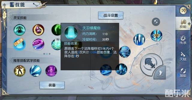 由于要快速清怪,所以在进入副本之前要选择好高级武学和灵宝技能。貂爷我在这里推荐大家带大天雷音和天羽镇魔扇,一个是爆发AOE输出技能,一个是持续AOE输出技能,二者配合起来,清小怪速度会非常快。