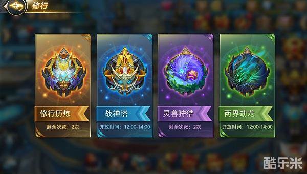 修行分为四种玩法: 修行历炼、战神塔、灵兽狩猎与两界劫龙。