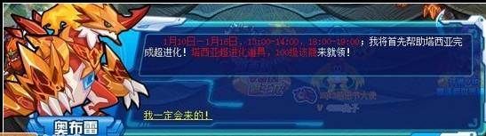 来到龙王殿堂,进入动画剧情。剧情结束后,哈克萨斯的师父奥布雷告诉大家,本次活动时间为1月10日-1月16日,13:00-14:00,18:00-19:00。参加活动100%获得塔西亚超进化道具,100级BOSS克星该隐。本周是不可获得精灵奥布雷的!