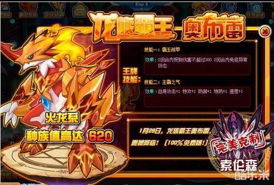 点击左边的奥布雷的头像按钮,了解这只精灵的资料!火龙系精灵奥布雷,种族值高达620,完美克制索伦森的精灵!王牌技能有技能一霸王战甲,2回合内受到伤害不超过300,2回合内免疫异常状态。技能二王霸之气,自身攻击、特攻、防御、特防、速度等级+1。奥布雷会在1月29日免费获得!