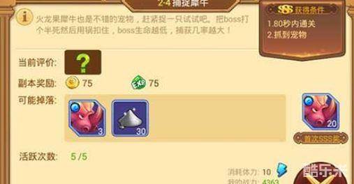 萌神战记捕捉宠物犀牛的正确姿势。游戏中的很多宠物都是可以被捕捉的,今天就和小编来看看捕捉犀牛这个关卡如何三星通关吧,顺便还可以知道萌神战记这款游戏是怎么在副本中捕捉宠物的。犀牛这个宠物有两个技能,比起初始的那些单技能宠物可要强力很多。