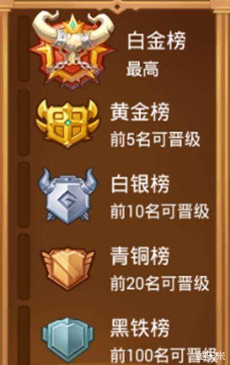 6、竞技场分为黑铁至白金5个榜位,各榜前列的玩家可选择晋级挑战,战胜后可以进入下一个榜单。