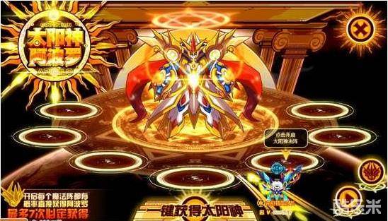大家也可以用分阶段开启太阳神法阵的方式购买,一共有7个法阵,在开启过程中随机获得阿波罗精元,最多7次必定获得阿波罗精元。每个法阵开启需要的米币2、6、10、12、15、18米币。