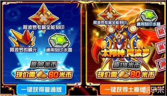 一键普通购买可获得阿波罗的精元和全能刻印,需要60米币。一键土豪购买可获得满学习力、极品性格、满个体值的阿波罗,以及全能刻印,需要80米币。