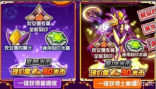 一键获得购买狄安娜有两个套餐:普通版套餐价格60米币,可以获得狄安娜的精元、狄安娜专属全能刻印和通用刻印水晶各一个。土豪版价格80米币,除了拥有刻印和水晶外,可以直接获得满级满学习力满个体的极品狄安娜。