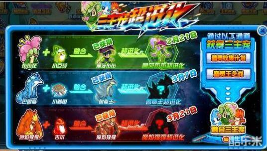 点击右下角的“三主宠超进化”,可以查看三大主宠的超进化时间安排。2月21日丽莎布布超进化开启,3月7日鲁斯王超进化开启,3月21日魔焰猩猩超近开启。如何获得三大主宠?最右边有方法介绍哦~