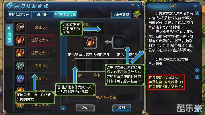 1.例如要合成一张“燎原之火(A)”特殊技能卡,选择之后在箭头右框放入说明中对应的特殊材料卡“神灵技能-炎石落(A)”,“神灵技能-离火威势(A)”,“神灵技能-离火护身(A)”及合成操作必备道具“仙灵符”,同时可额外放入最多四张祭卡用来提高合成成功率,点击合成,成功即可得到这张特殊技能卡。