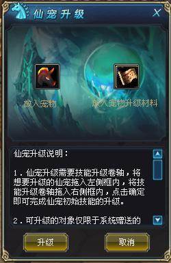 1.玩家可至成都城NPC“仙宠升级大使”处对初始状态只拥有1个技能的仙宠进行升级。