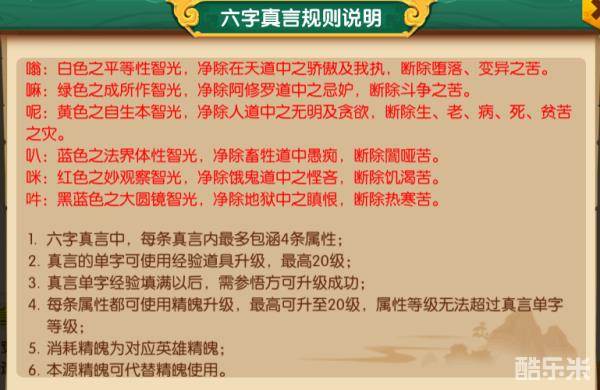 最后附上关于六字真言的一些说明,解锁之后各位玩家也可点击六字真言面板左上角的问号按钮查看规则哦~