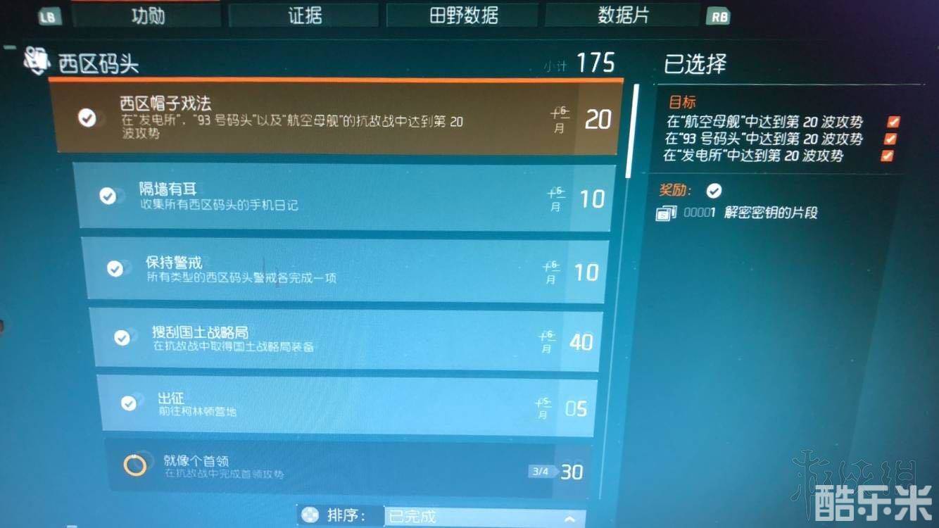 首先是前提条件,目标是取得两个新的证据监测信息(其实就是两段特殊求救信号,具体作用不做剧透,自己最后品味下来自暗区深处通话那头的无奈和绝望)。需要1、完成三个抵抗各20波的帽子戏法功勋;2、收集全部西区码头38个电话录音(南北各19个)。回柯林营地交任务之后取得两个监测信息(如图3)。