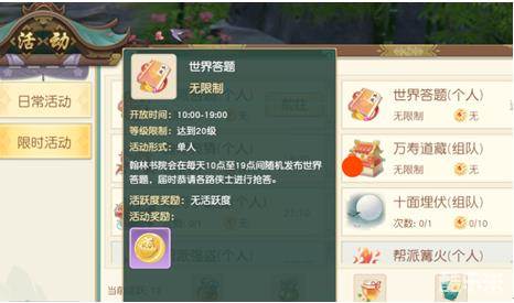 l 世界答题是游戏里某个时间点出现的答题活动,大侠需要借由世界聊天频道输入答案进行抢答,回答正确并且速度快的大侠会获得丰厚奖励;