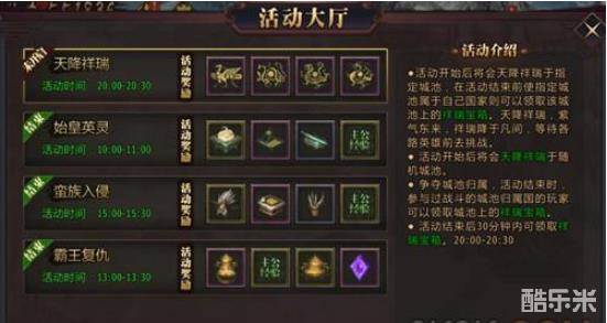 争夺城池归属,活动结束时,参与过战斗的城池归属过的玩家可以领取城池上的祥瑞宝箱。