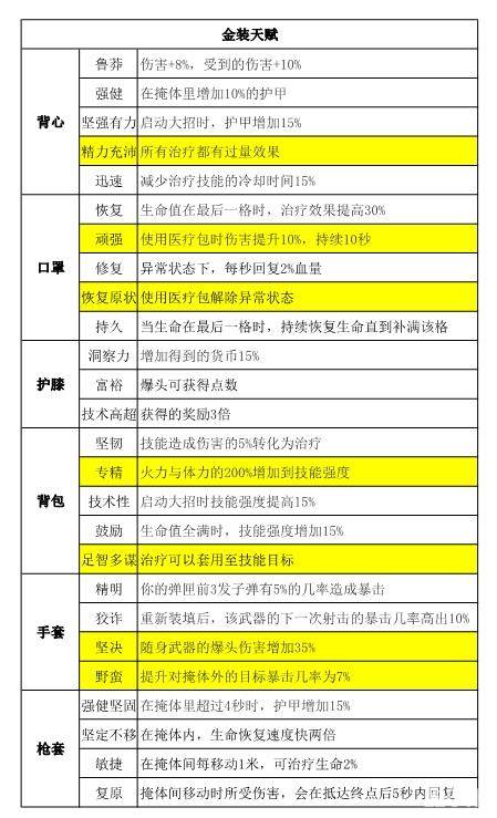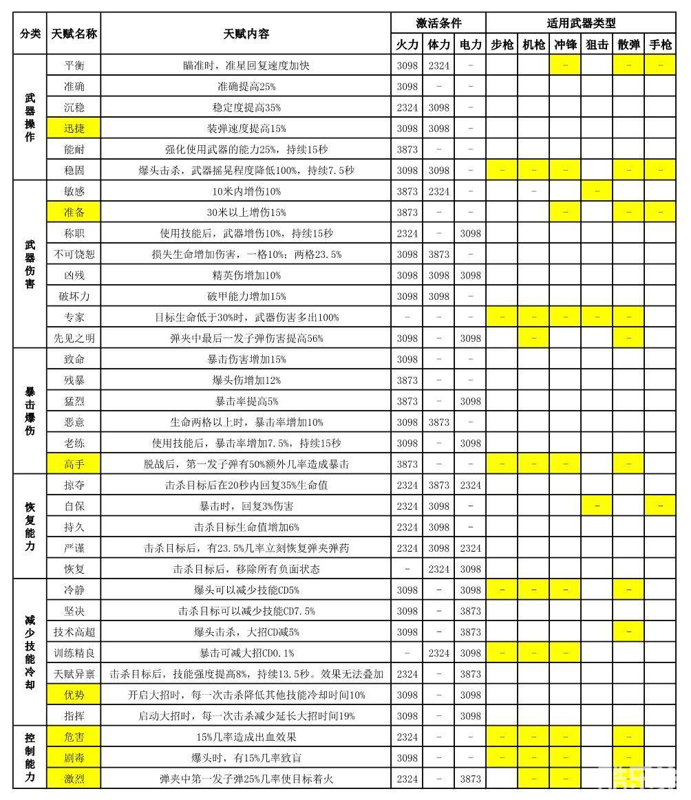 【TIP】标黄的为1.4更新中加强的天赋技能