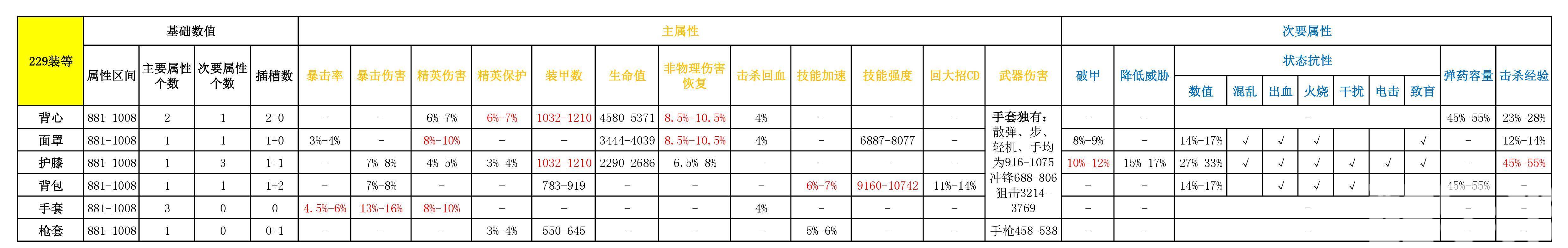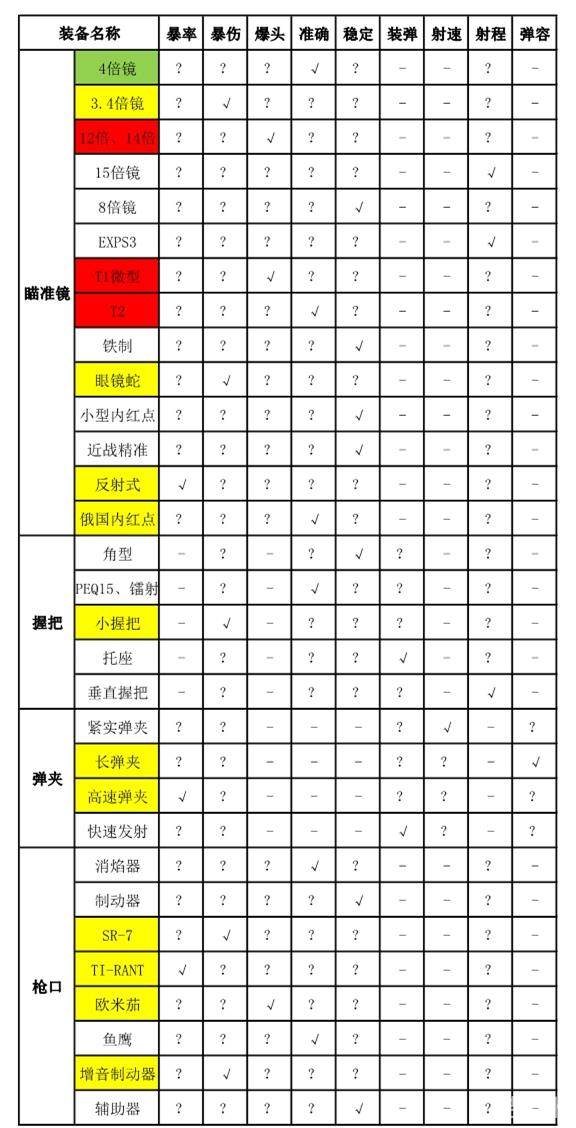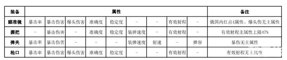 1.4的武器配件删除了很多鸡肋属性,也降低了输出属性,导致现在暴击率、暴击伤害、爆头伤很难堆。配件简单来说,每个配件1个主属性,2个随机副属性,但有几个例外,俄国内红点3个随机副属性,爆头伤只在枪口有主属性(下表中标红的带爆头伤的瞄准镜都是垃圾),射速、弹容只有弹夹有,枪口无有效射程主属性