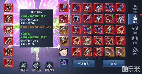 对了,装备还有强化等级总和、镶嵌宝石等级总和、装备星级总和三种额外属性加成,当金币不是很充足的时候,别一味的只强化已经高等级了的装备,强化一下低等级的装备让整体强化等级总和达标,也许是不错的选择。