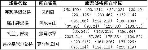 每日活动开启后,系统会自动提示到下列指定的地点去击杀,大量财宝等你来拿!活动时间结束后,若魔君部将并未死亡,则自动消失。